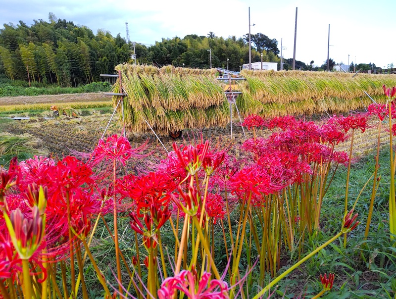 稲刈りも始まり、今では珍しい天日干しの稲。