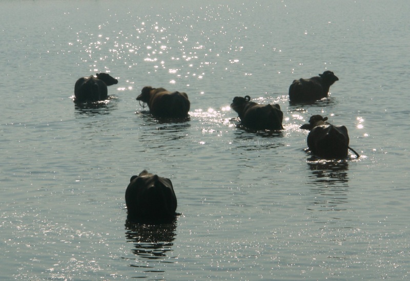 アグラ市内の池に入る牛の群れ