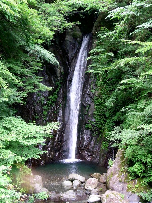 これは登山口に向かう神ノ川林道から見えるエビラ沢の滝です。