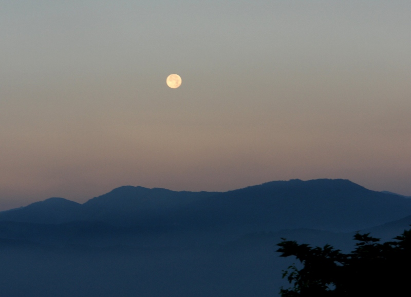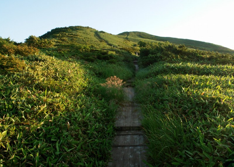 平標山の家に泊まった翌朝、黎明に小屋を出ると苗場山の上空に